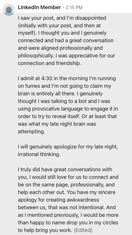 Then the tone shifted. Quickly. Flirting turned into pressure. Comments became explicit. When I didn’t respond the way he wanted, he got angry. Called me a bot. Demanded I “prove I was real.” Name-dropped people in my network. Threatened to tell my clients I was a fraud.